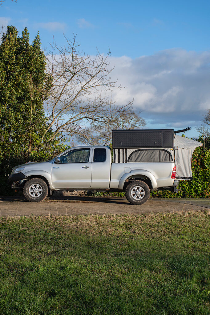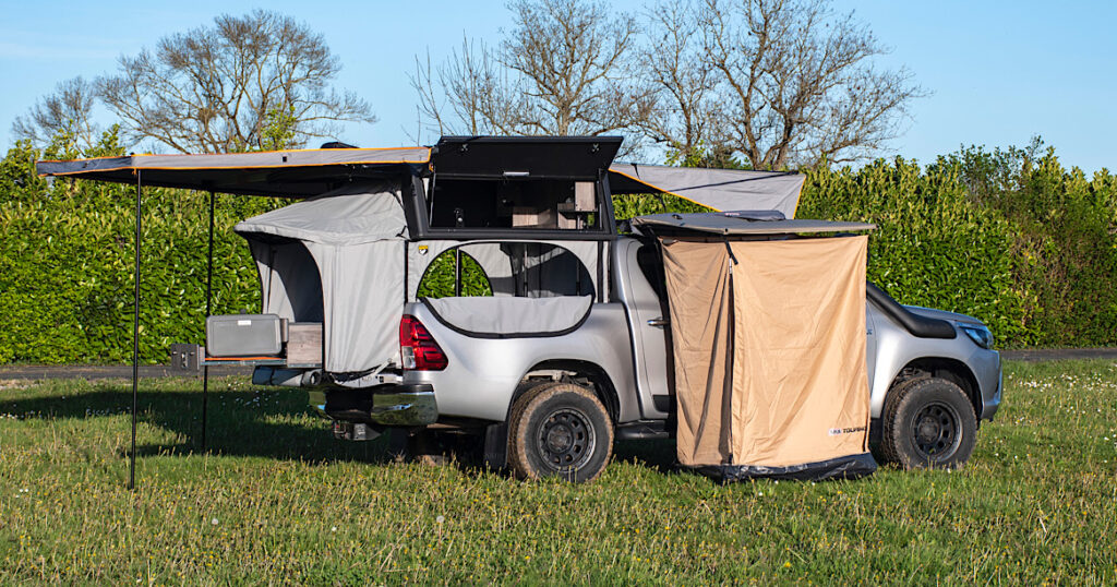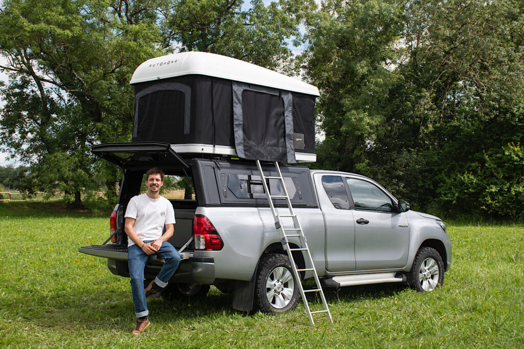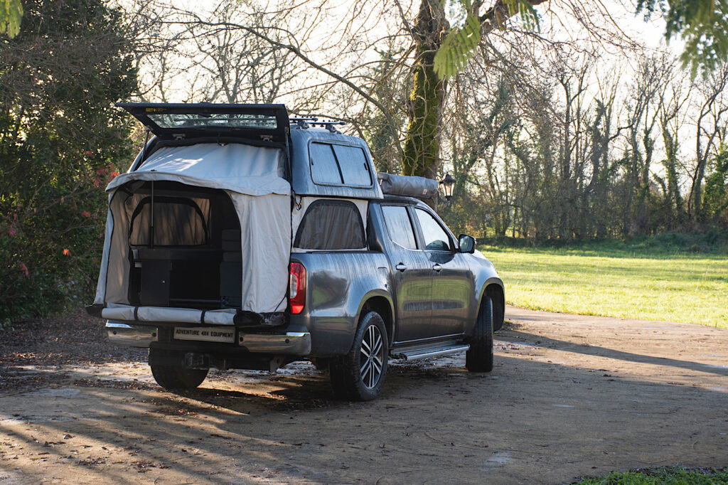 Une invitation à la déconnection avec cet aménagement qui offre 2 espaces pour dormir : Un lit dans la benne et un autre dans la tente de toit. Du rangement et un espace cuisine à l'arrière de la benne et un espace technique dans le fond de la benne pour couronner le tout. Alors prêt à en voir plus ?